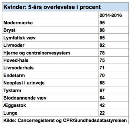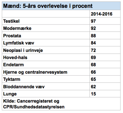 Ifølge nye tal fra Sundhedsdatastyrelsen for 2014-16 er den samlede 5-års overlevelse nu på 62 procent for mænd og 65 for kvinder for de fleste kræftformer.