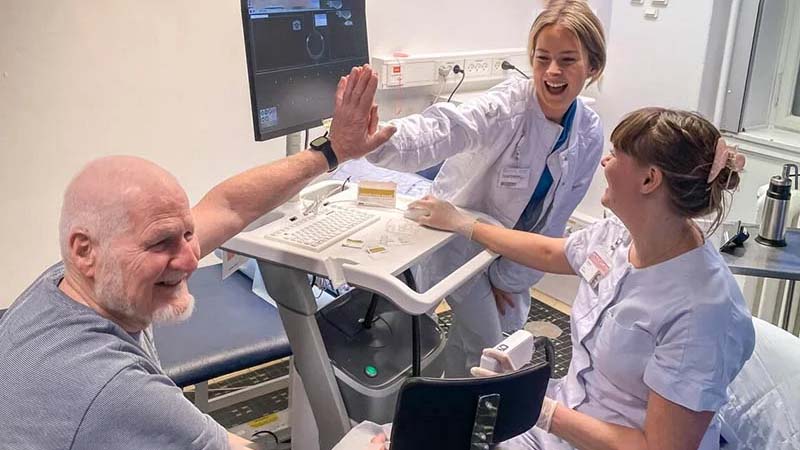 “Vi havde ingen garanti for, at det ville virke, så det var et sats. Nu står vi med kvalitetsevidens fra et kontrolleret videnskabeligt forsøg, og det er fantastisk. Det åbner for nye HPV-målrettede veje for forskning i forebyggelse og behandling af hudkræft. Måske et paradigmeskifte,” udtaler Emily Wenande, der her giver patienten Jørgen Høj en highfive i jubel over resultaterne.