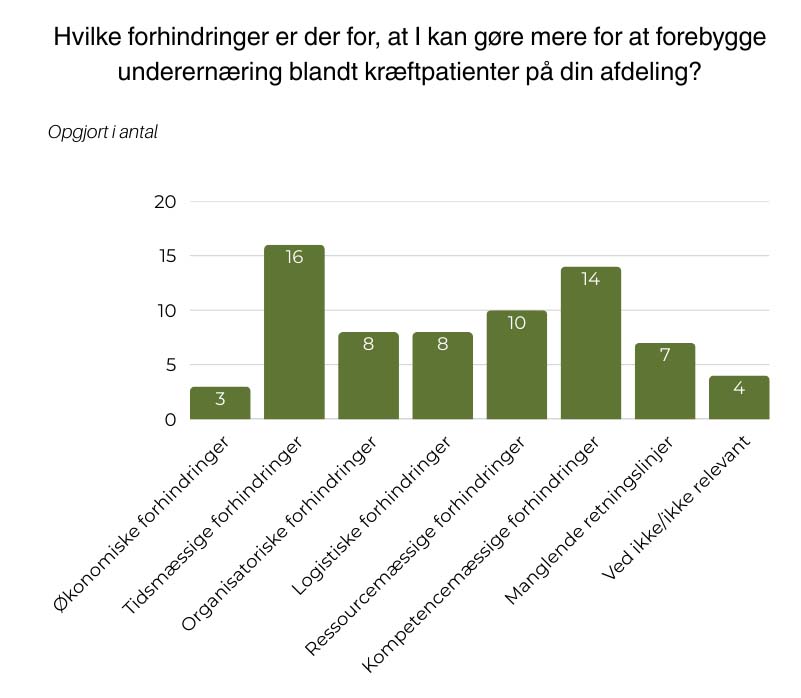 Undersøgelsen af de yngre onkologers holdning til ernæringsindsatser viser også hvilke barrierer, der står i vejen for at prioritere ernæringsindsatsen. Her peger de yngre onkologer primært på faktorer som tidspres, manglende ressourcer, manglende økonomi og organisatoriske forhindringer. Netop manglende organisering og systematik mener Troels Dreier Christensen også er en væsentlig barriere.