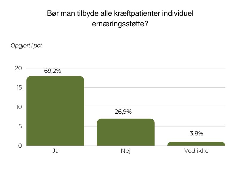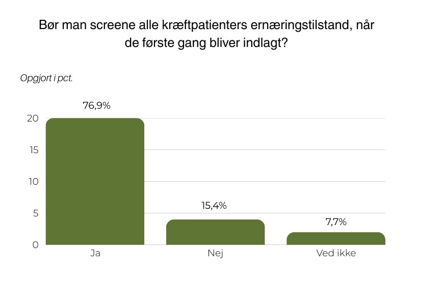 Her svarer 77 procent, at man bør screene alle kræftpatienters ernæringstilstand, når de bliver indlagt første gang. Og 69 procent mener, at man bør tilbyde alle kræftpatienter individuel ernæringsstøtte.